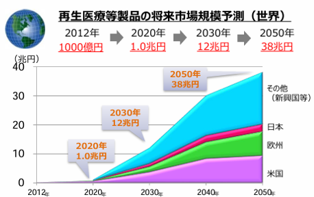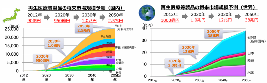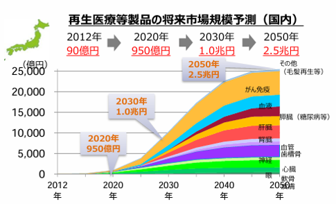 内閣府が発表した『再生医療・遺伝子治療の産業化に向けた基盤技術開発事業複数課題プログラムの概要』によれば、再生医療分野は今後大きな成長が見込まれており、2050年には日本国内市場で約2.5兆円、世界市場では約38兆円規模に達すると予測されています。この数字は、再生医療が医療経済において重要な柱となる可能性を示しており、医療技術の革新と産業化の両面で大きなインパクトを持つことが期待されています。